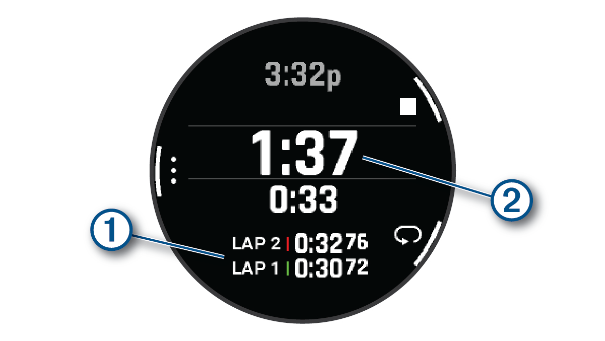 - To return to the watch face without resetting the timers, press MENU, and select Go to Watchface.
