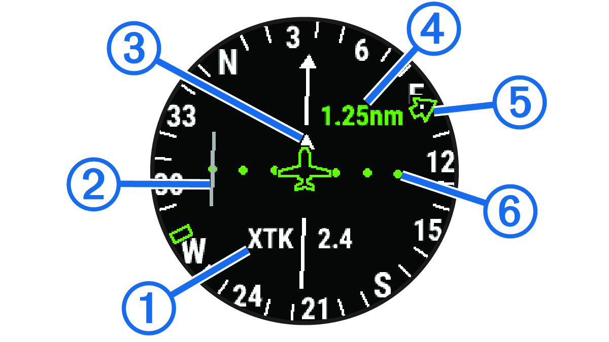 ตัวบ่งชี้ความเบี่ยงเบนของคอร์ส (Course deviation indicator หรือ CDI) บ่งชี้ตำแหน่งของเส้นคอร์สที่ต้องการที่สัมพันธ์กับตำแหน่งของคุณ |