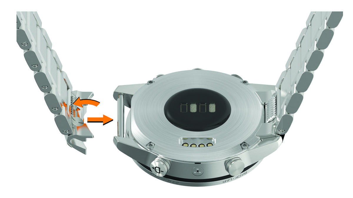 更换一体式QuickFit表带 拉开闩锁,接着从表上拆下QuickFit表带或表链。 拉开表带或表链上的闩锁,接着对齐手表。 置入并闩上腕表。注意:请确定表带或链带牢固。闩锁应紧闩住腕表。闩锁和表带或链带之间应该有一点小空隙①。 主页设备维护更换一体式QuickFit表带