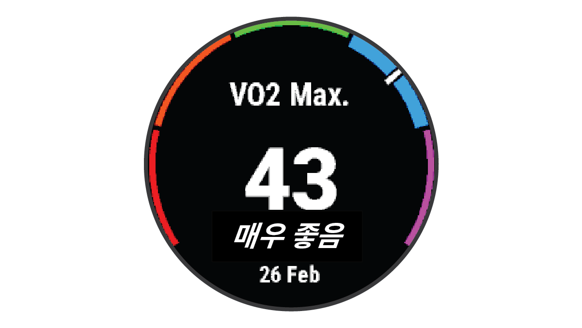 장치에서 사용자의 VO2 max.는 수치, 설명, 컬러 게이지 상의 위치로서 나타납니다. Garmin Connect 계정에서는 VO2 max.에 관한 추가적인 상세 정보(예를 들면 사용자의 연령이나 성별에 따라 표시되는 이 수치의 순위)를 볼 수 있습니다.