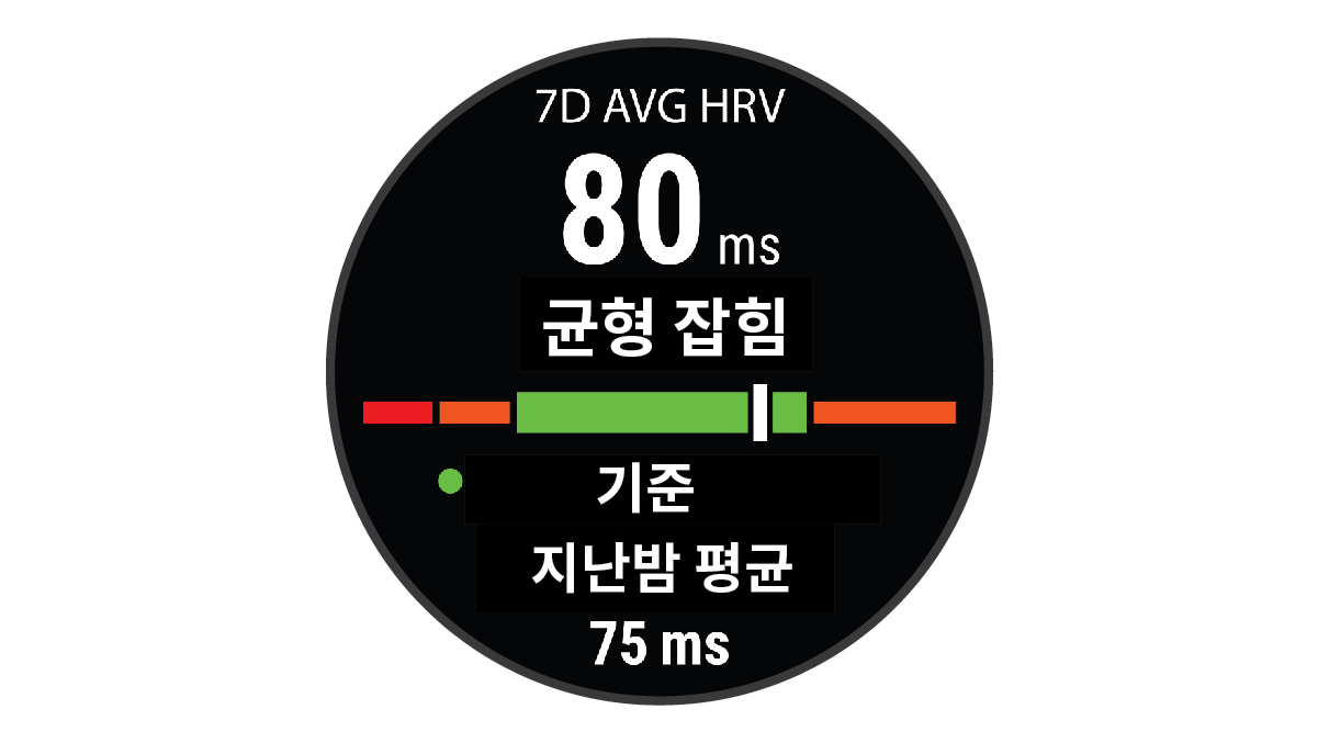 이 기능에는 Garmin 가슴 삼박계가 필요합니다. 심박수 변화(HRV: 심박 변이도)를 확인하려면, 심박계를 착용하고 장치와 심박계를 서로 페어링시켜야 합니다(45 페이지, 무선 센서 페어링하기).