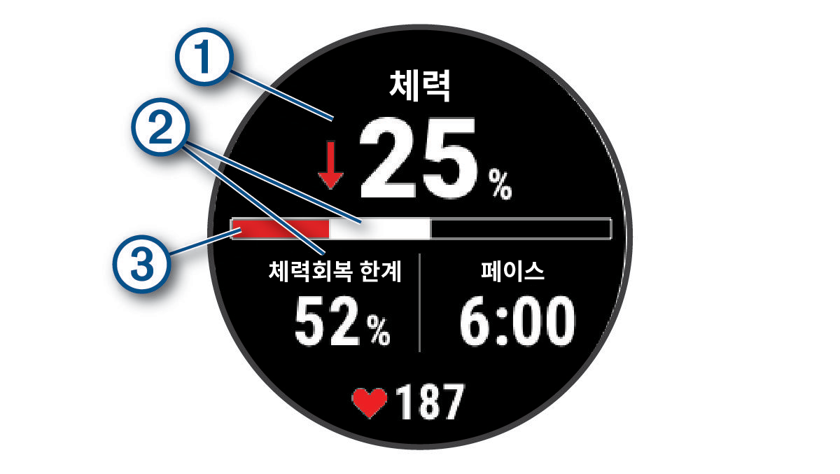 주 체력 데이터 필드. 현재 체력 퍼센티지, 남은 거리, 남은 시간을 표시합니다. |