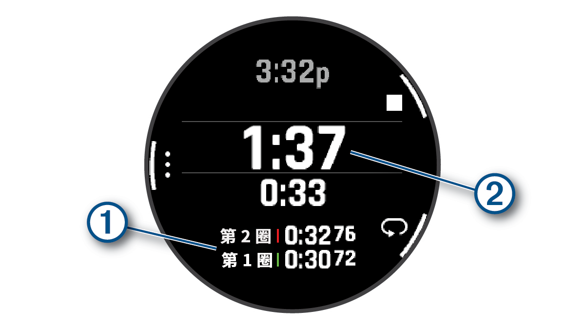 - 要开启或关闭圈计时,按 MENU 键,然后选择 LAP 键。