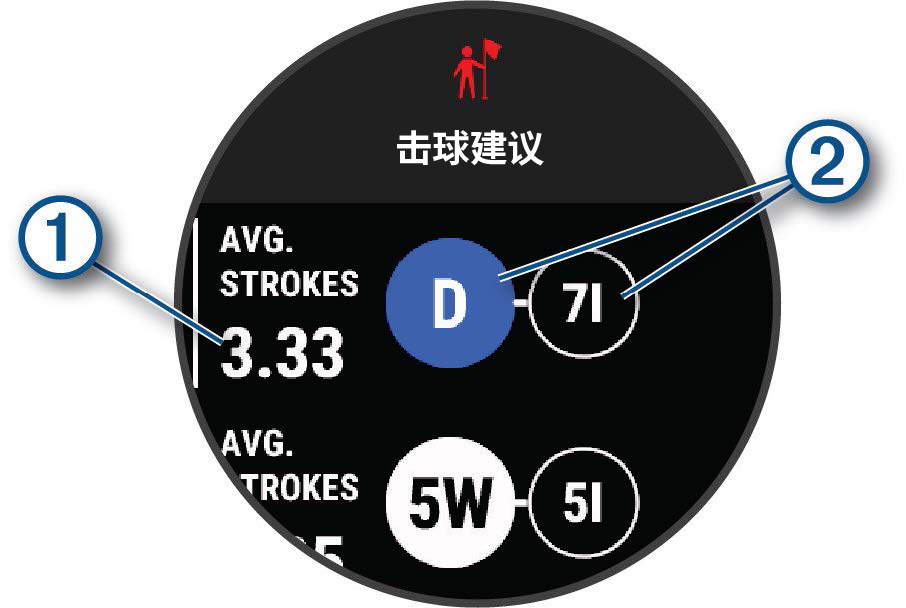 设备将显示推荐球杆 ② 的平均杆数 ①。