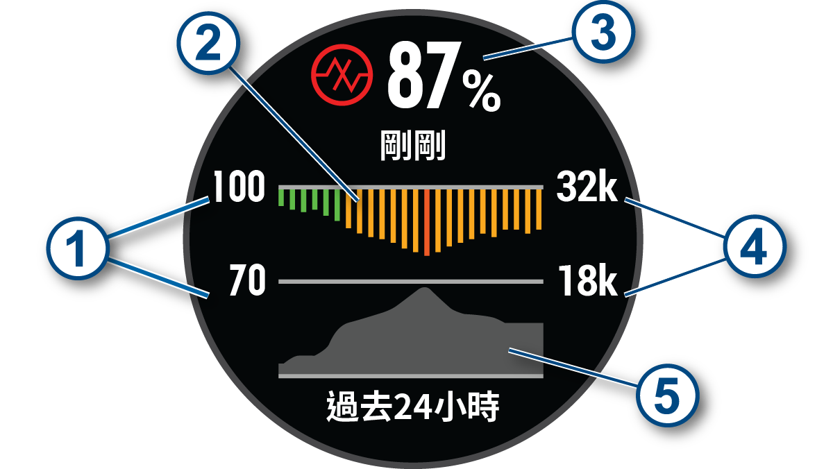 脈搏血氧感測功能以圖形、百分比和顏色顯示血氧飽和度。您可以在 Garmin Connect 檢視有關脈搏血氧功能的其他詳細資訊,以及過去特定期間的趨勢。