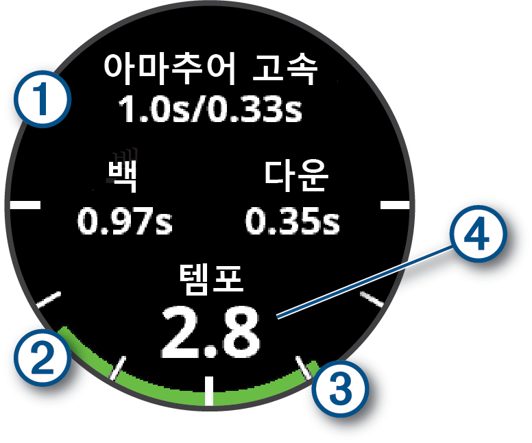 템포 트레이닝 활동은 사용자가 더욱 일관적인 스윙을 할 수 있도록 도와줍니다. 장치가 사용자의 백스윙 시간과 다운스윙 시간을 측정하고 표시합니다. 장치는 스윙 템포 또한 표시합니다. 스윙 템포는 백스윙 시간을 다운스윙 시간으로 나눈 비율 값입니다. 3대 1의 비율 혹은 3.0이 프로 골퍼들을 대상으로 한 연구에서 보여지는 이상적인 스윙 템포입니다.