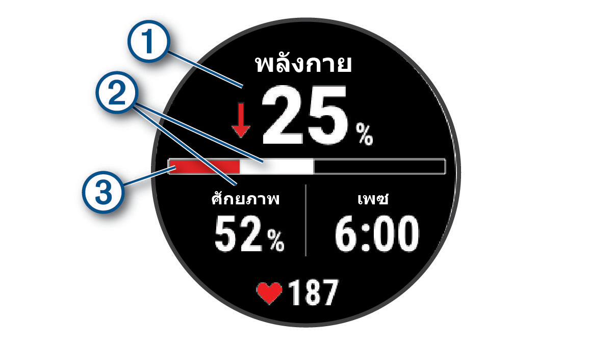 นาฬิกาของคุณสามารถจัดให้มีการประเมินพละกำลังแบบเรียลไทม์ตามข้อมูลอัตราการเต้นของหัวใจและการประมาณ VO2 max ได้ (เกี่ยวกับการประเมิน VO2 Max.)