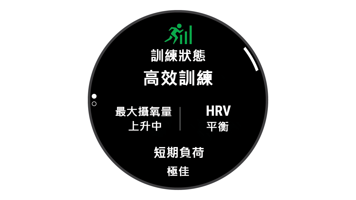 訓練狀態可以看出您的訓練對體能與表現產生的影響。訓練狀態是根據您的最大攝氧量、短期負荷及 HRV 狀態的長期變化而得出。您可以使用訓練狀態規劃未來的訓練並持續提升體能。