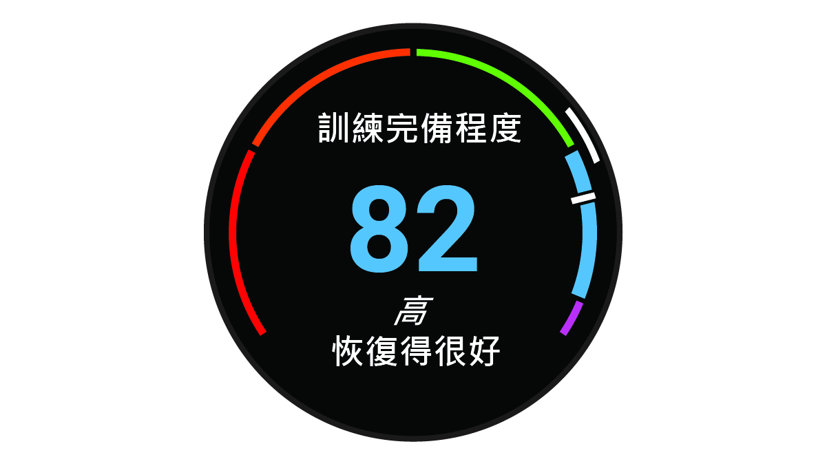 訓練完備程度:手錶會使用訓練、恢復、睡眠等資料提供完備程度分數,讓您判斷當下是否為進行高強度訓練或是放鬆的最佳時機()。