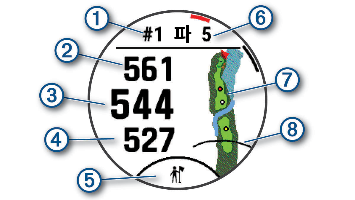 참고: 핀 위치가 변경되기 때문에, 장치는 그린의 앞쪽, 중앙, 뒤쪽까지의 거리를 계산하지만, 실제 핀 위치까지의 거리는 계산하지 않습니다.