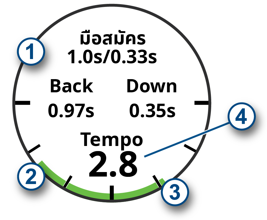 อุปกรณ์แสดงกราฟที่บ่งชี้หากเวลาการตีแบคสวิงหรือดาวน์สวิงของคุณเร็วไป, ช้าไป, หรือพอดีแล้วสำหรับการควบคุมจังหวะที่คุณเลือกไว้