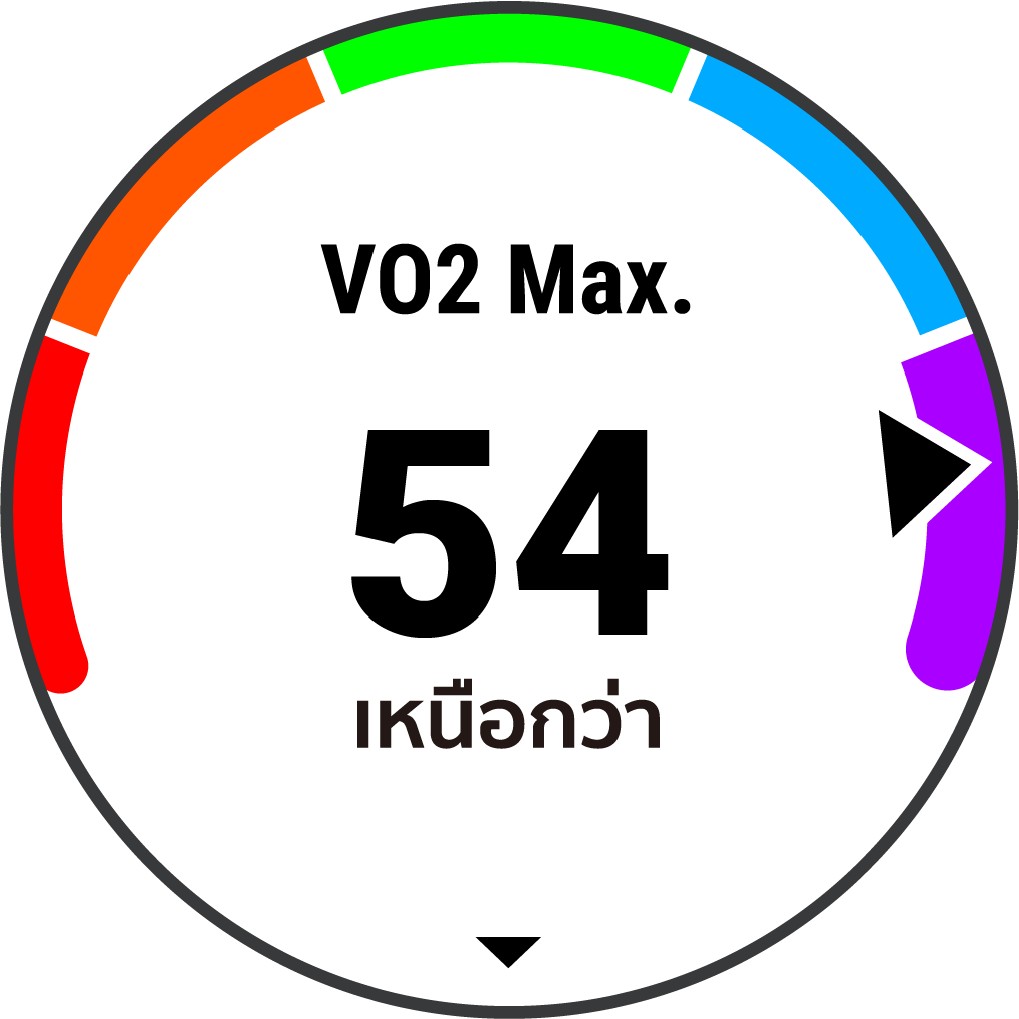 ข้อมูล VO2 max. ได้รับการจัดหาโดย FirstBeat การวิเคราะห์ VO2 max. ถูกจัดเตรียมให้โดยได้รับความยินยอมจาก The Cooper Institute® สำหรับข้อมูลเพิ่มเติม, ดูภาคผนวก (การแบ่งระดับมาตรฐาน VO2 Max.), และไปที่ www.CooperInstitute.org