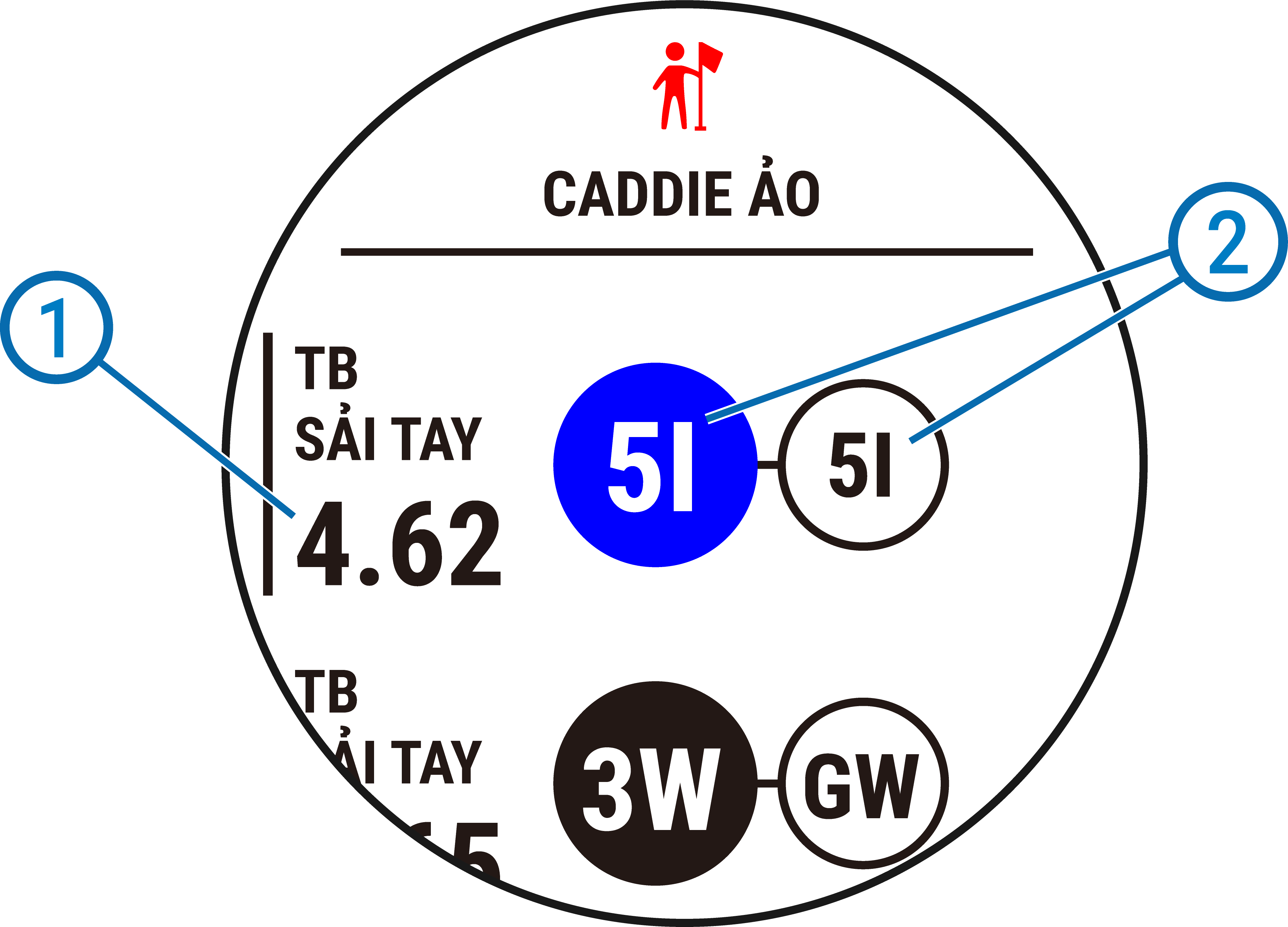 LƯU Ý: Thiết bị tự động tính toán lại đề xuất gậy khi bạn chuyển sân. Bạn có thể chọn Tính toán lại để cập nhật đề xuất gậy một cách thủ công.