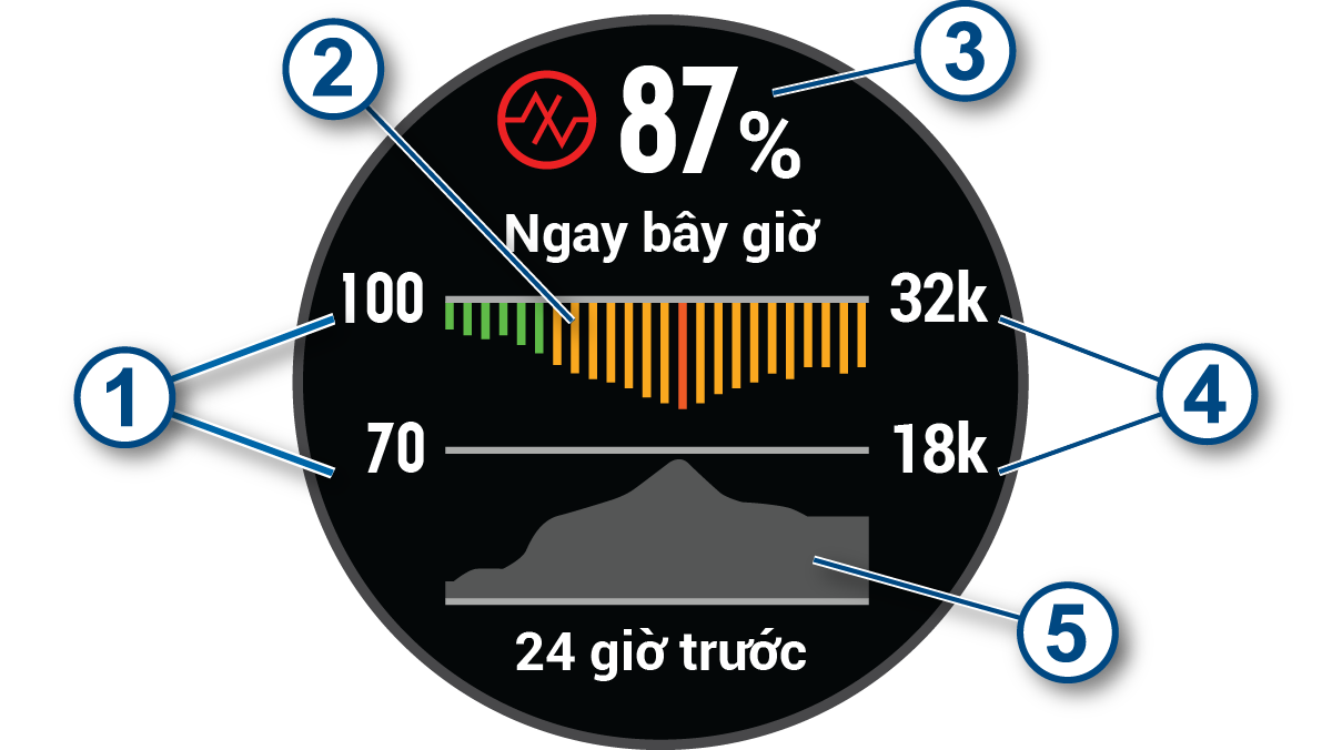 Trên thiết bị, các chỉ số đo nồng độ oxy của bạn xuất hiện dưới dạng tỷ lệ phần trăm bão hòa oxy và màu sắc trên biểu đồ. Trên tài khoản Garmin Connect của bạn, bạn có thể xem các thông tin chi tiết bổ sung về các chỉ số đo nồng độ oxi của bạn, bao gồm các xu hướng trong nhiều ngày.