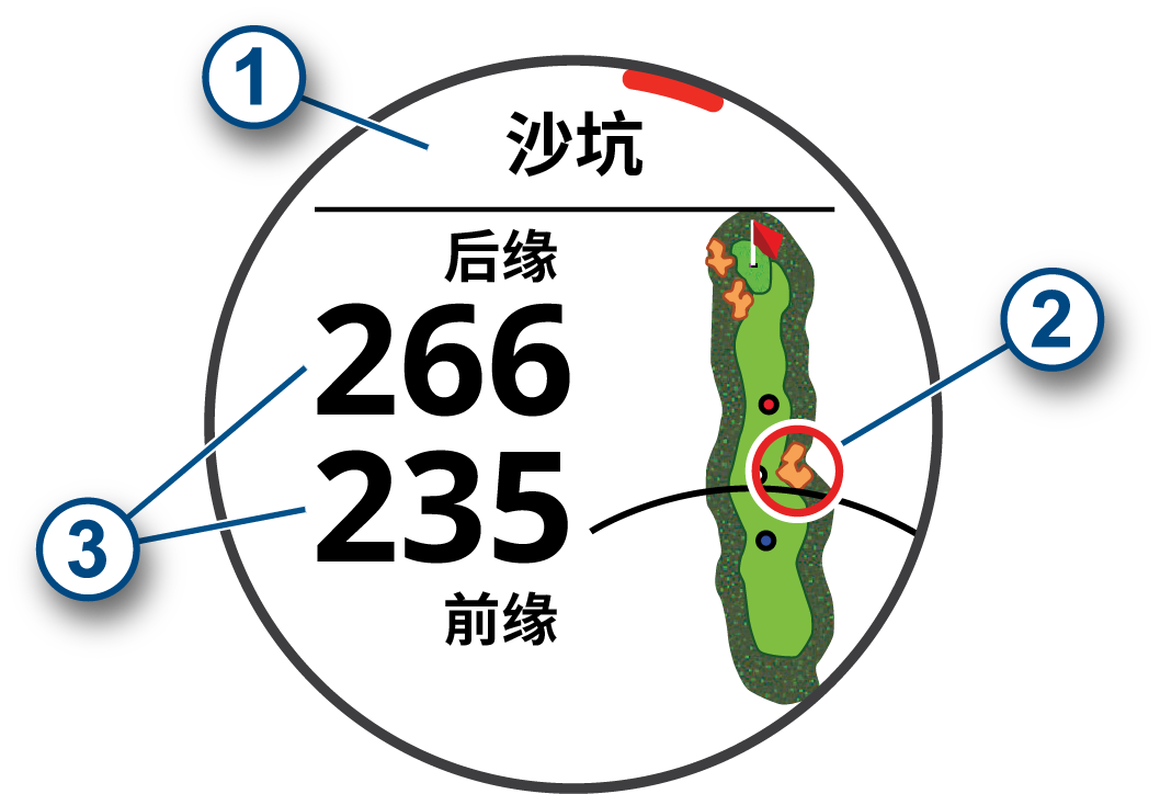 障碍和置球点按下 DOWN 键可翻页预览当前球洞的障碍、置球点及自定义目标。 ① 障碍类型或置球点距离。 ② 障碍或置球点位置标识。 ③ 到置球点距离或到障碍前、后沿距离。 使用按键定位测量距离保存自定义目标主页高尔夫障碍和置球点