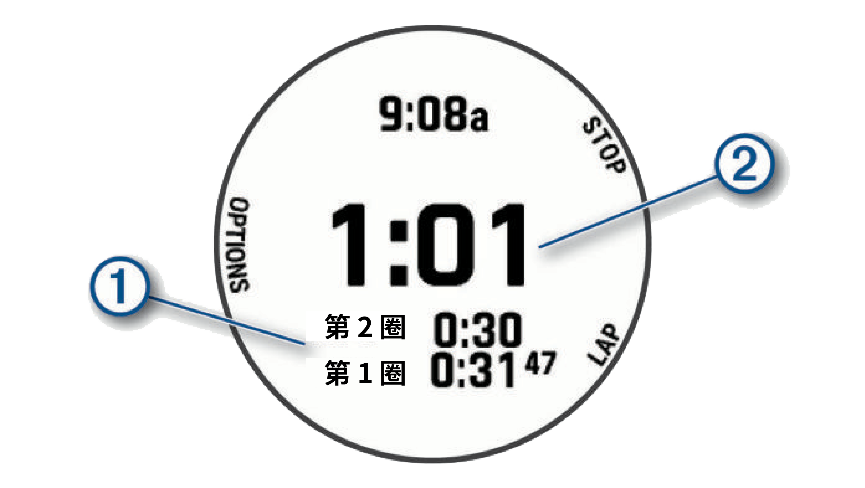 - 若要在不重置計時器的狀態下返回時間錶面,按下 MENU鍵,並選擇 回到錶面。