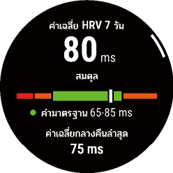 สถานะ HRV: นาฬิกาจะวิเคราะห์การอ่านอัตราการเต้นหัวใจจากข้อมือในขณะที่คุณกำลังหลับเพื่อระบุสถานะการแปรปรวนของอัตราการเต้นหัวใจ (HRV) ตามค่าเฉลี่ย HRV ระยะยาวของคุณ (สถานะความแปรปรวนอัตราการเต้นหัวใจ)