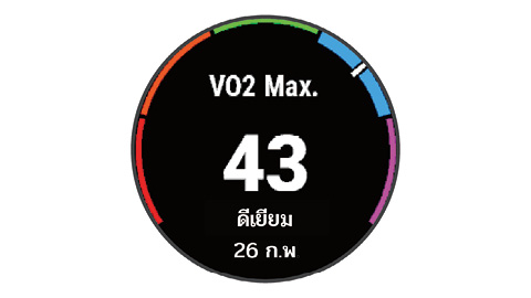 ข้อมูล VO2 max. ได้รับการจัดหาโดย FirstBeat การวิเคราะห์ VO2 max. ถูกจัดเตรียมให้โดยได้รับความยินยอมจาก The Cooper Institute® สำหรับข้อมูลเพิ่มเติม ดูภาคผนวก (การแบ่งระดับมาตรฐาน VO2 Max.) และไปที่