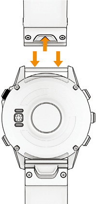การเปลี่ยนอุปกรณ์เสริม QuickFit แบบบานพับ เลื่อนสลักบนสายนาฬิกา QuickFit แบบบานพับ และถอดสายออกจากนาฬิกา เรียงสายนาฬิกาแบบบานพับใหม่ให้ตรงกับนาฬิกา กดให้สายนาฬิกาเข้าที่ หมายเหตุ: ดูให้แน่ใจว่าสายนาฬิกาแน่นหนาแล้ว สลักควรปิดครอบหมุดนาฬิกาหน้าหลักข้อมูลอุปกรณ์การเปลี่ยนอุปกรณ์เสริม QuickFit แบบบานพับ