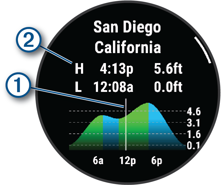 24 小时潮汐图表可显示当前日期与当前潮汐高度 和以及下次涨潮和落潮信息