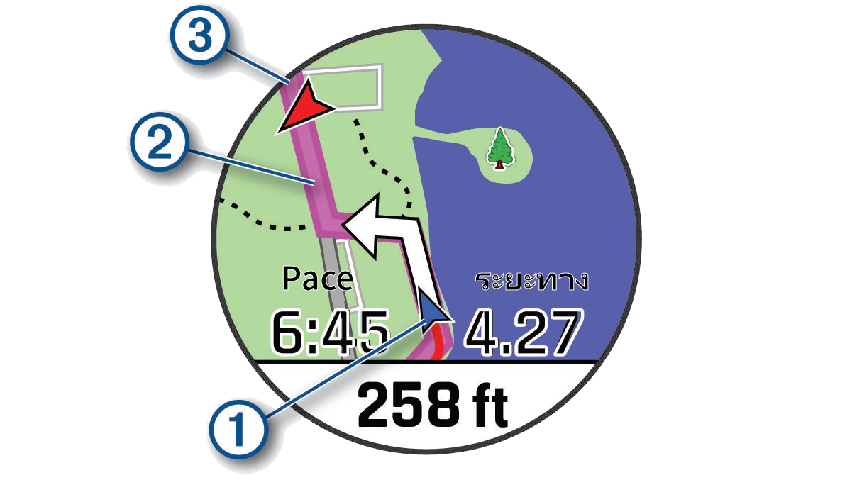 คุณสามารถนำทางกลับไปยังจุดเริ่มต้นของกิจกรรมปัจจุบันของคุณแบบเป็นเส้นตรงหรือตามเส้นทางที่คุณได้เดินทางผ่านมาแล้วได้ คุณสมบัตินี้มีให้ใช้งานเฉพาะกิจกรรมที่ใช้ GPS เท่านั้น