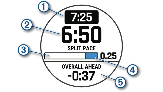 设备显示您的分段目标配速 ①,当前分段配速 ②,分段的完成度 ③,分段中剩余的距离 ④ 以及目标速度之前或之后的总时间 ⑤。