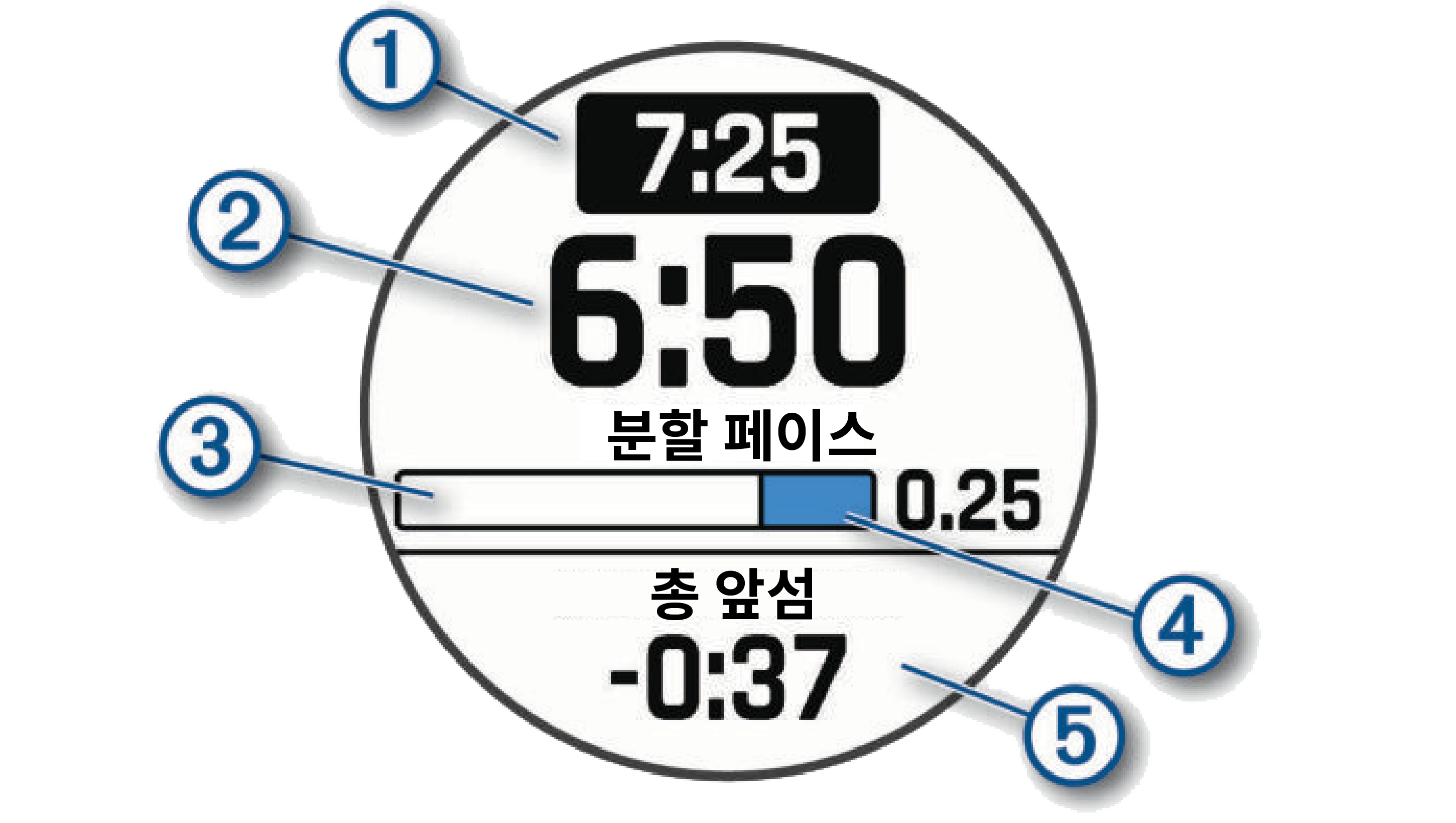 목표 페이스에 대한 총 앞선 시간 또는 뒤쳐진 시간 |