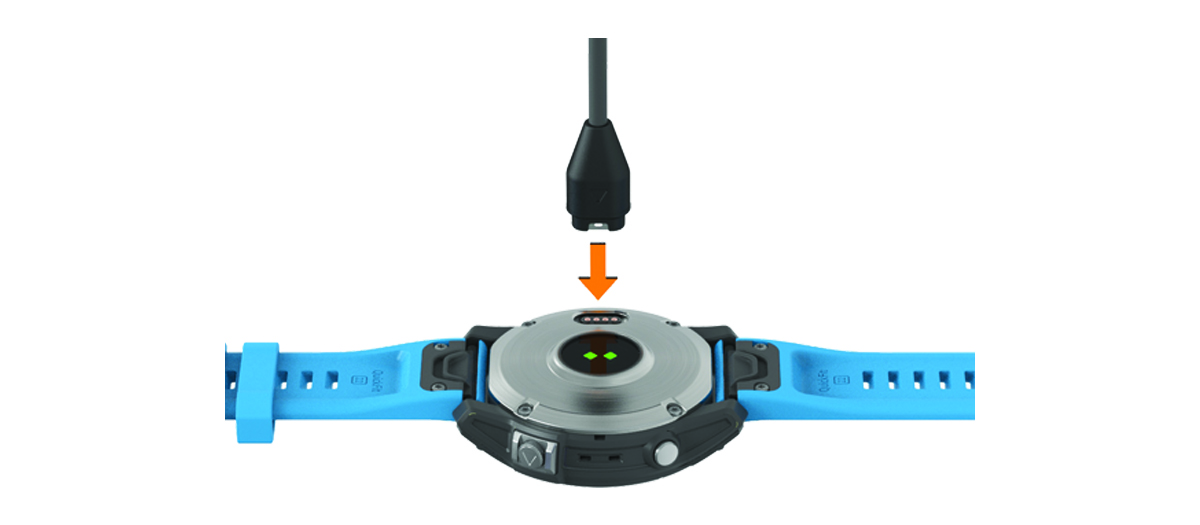 為手錶充電 警告裝置內含鋰離子電池。請參閱包裝內說明的《安全及產品資訊須知》取得產品警告和其他重要資訊。注意充電或連接至電腦前,請務必清潔並保持傳輸接點與周圍區域乾燥,以免鏽蝕。請參閱清潔指示(裝置保養)。 將連接線( 端)插入手錶的充電埠。 將連接線的另一端插入 USB 供電埠。 手錶會顯示目前的電池電量。太陽能充電首頁裝置資訊為手錶充電