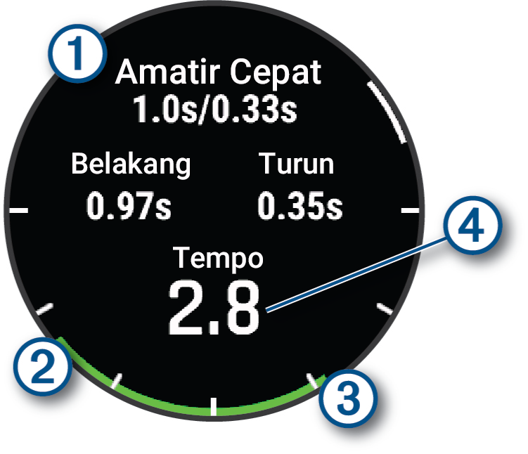 Aktivitas Latihan Tempo membantu Anda melakukan ayunan yang lebih konsisten. Perangkat mengukur dan menampilkan waktu backswing dan waktu downswing Anda. Perangkat juga menampilkan tempo ayunan Anda. Tempo ayunan adalah waktu ayunan ke belakang dibagi dengan waktu ayunan ke bawah, dinyatakan dalam rasio. Rasio 3 banding 1, atau 3,0, adalah tempo ayunan ideal berdasarkan studi pemain golf profesional.