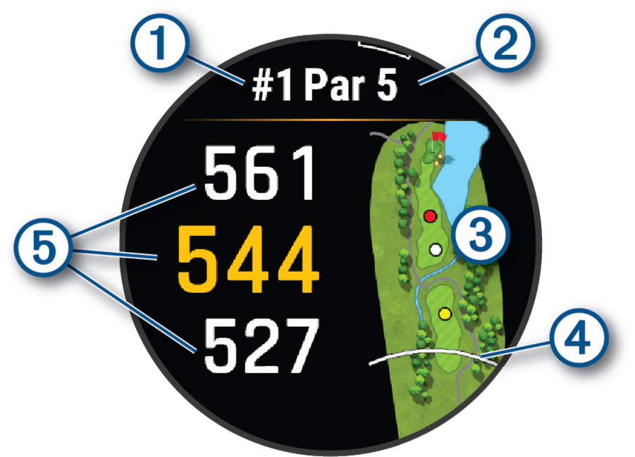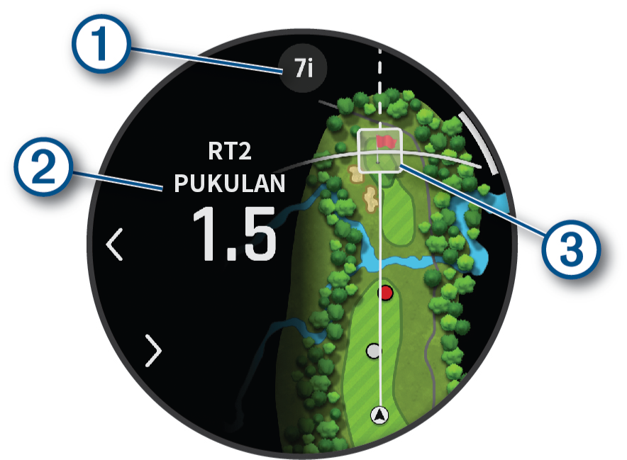 CATATAN: Karena lokasi pin berubah-ubah, jam tangan menghitung jarak ke depan, tengah, dan belakang dari green, tapi bukan lokasi pin sebenarnya.