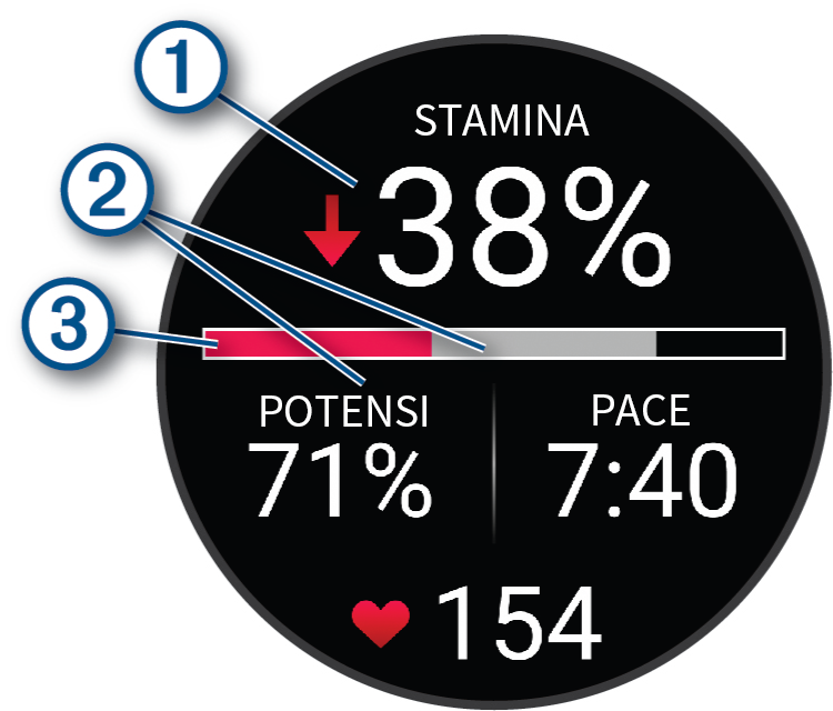 Jam tangan Anda dapat menyediakan perkiraan stamina secara real-time berdasarkan perkiraan data denyut jantung dan VO2 max. (Tentang Perkiraan VO2 Max.).