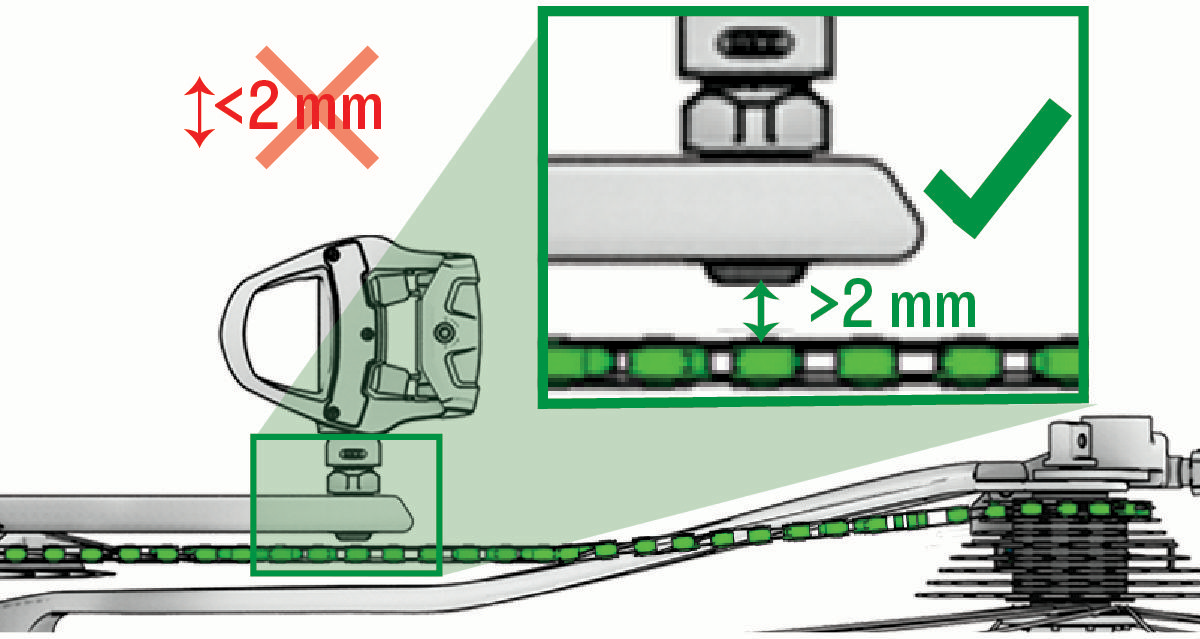 ペダルのスピンドルとチェーン、変速機(グループセット)、フレームなどのバイクの各部品との間に、少なくとも2mmのクリアランスがあることを確認してください。走行中にフレーム、チェーン、または変速機のいずれかがスピンドルに接触すると、スピンドル内の電子機器が損傷し、製品の故障につながる可能性があります。