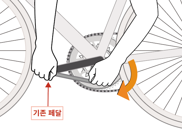 기존 페달 제거하기 페달 렌치가 자전거의 뒤쪽을 가리키도록 하여 스핀들에 페달 렌치를 끼웁니다. 한 손으로 페달을 고정한 상태에서 다른 손으로 페달 렌치를 아래로 누릅니다. 구동계 반대쪽(왼쪽)구동계 쪽(오른쪽) 페달이 빠질 때가지 페달 렌치를 한 방향으로 계속 돌립니다. 알코올에 적신 깨끗한 헝겊으로 크랭크 홀을 닦습니다. 홈소개설치 준비하기기존 페달 제거하기