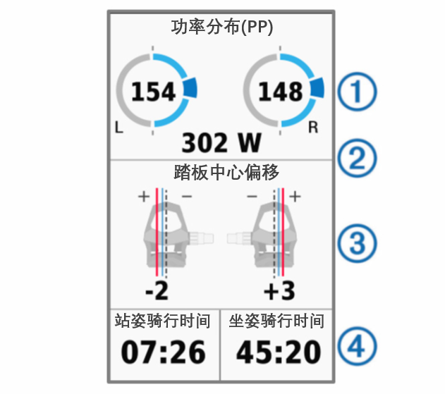 - 滑动至骑行动态页面以查看您的功率分布 ①,总功率 ② 和踏板中心偏移 ③ 数据。