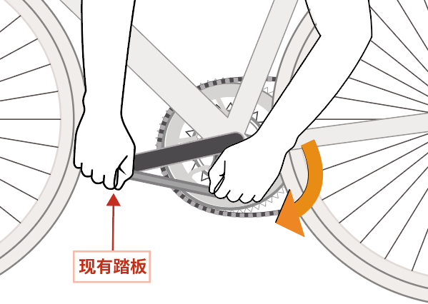 拆卸现有踏板 将踏板扳手与主轴对齐,且扳手朝向自行车后轮。 一只手紧握踏板,另一只手按下踏板扳手。非驱动侧驱动侧 持续向同一方向旋转扳手,直至卸下踏板。 使用外用酒精浸湿干净的布擦拭曲柄脚踏孔。 主页产品介绍准备安装拆卸现有踏板