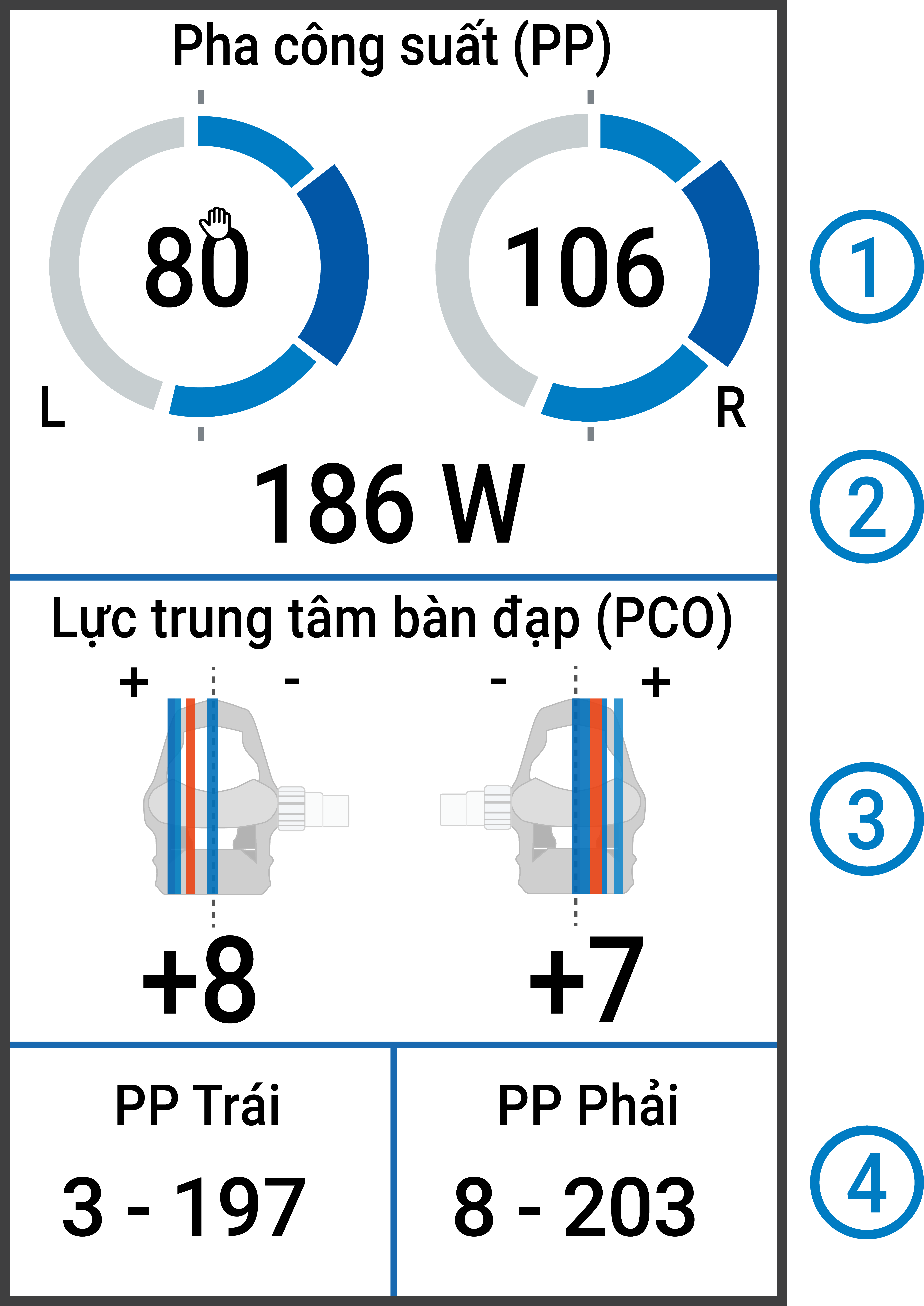 - Cuộn đến màn hình trạng thái đạp xe để xem dữ liệu pha công suất