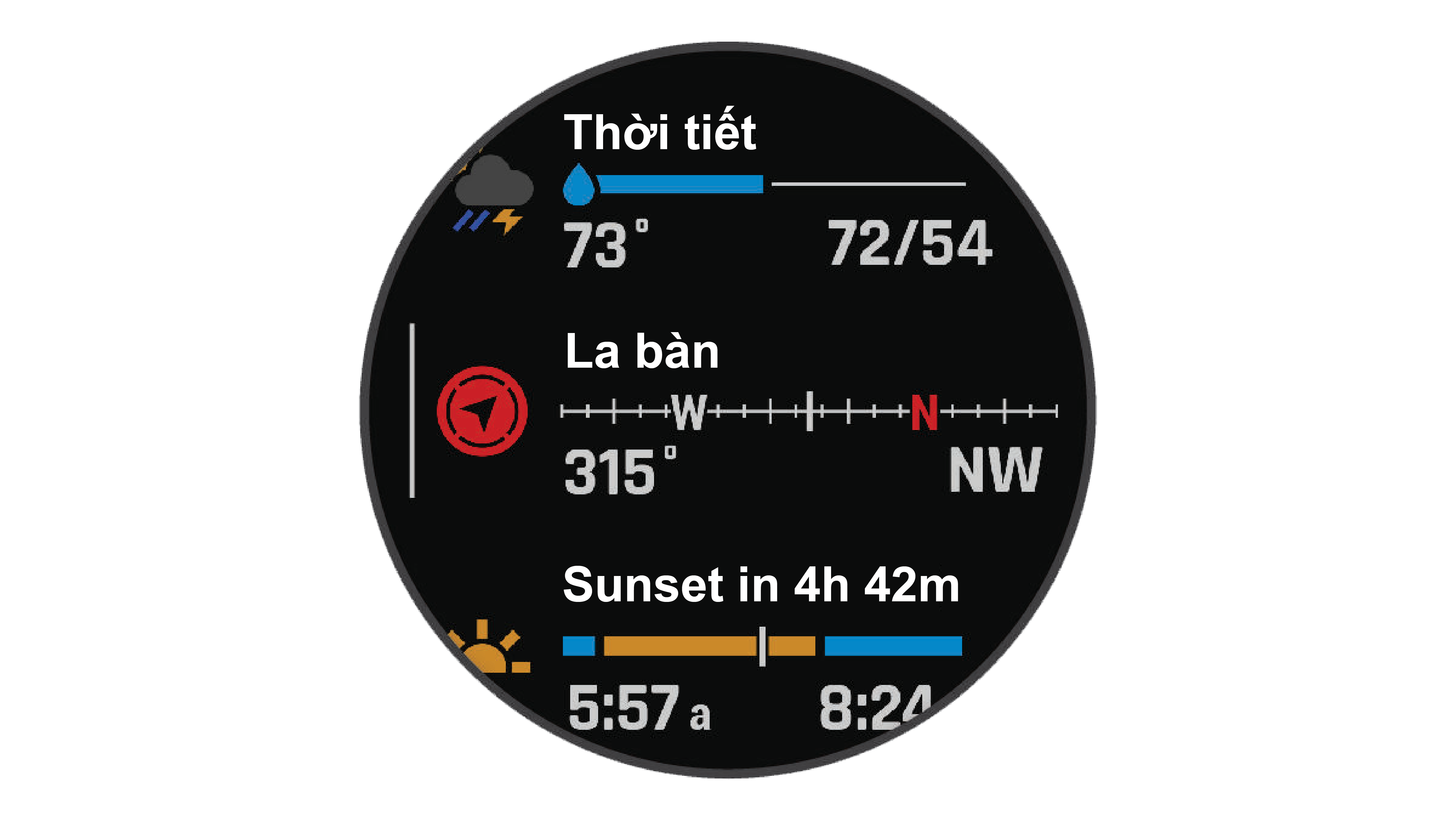 Chế độ công cụ tổng quan giúp truy cập nhanh vào dữ liệu sức khỏe, thông tin hoạt động, cảm biến tích hợp trên thiết bị và hơn thế nữa. Khi bạn ghép nối đồng hồ của bạn, bạn có thể xem dữ liệu từ điện thoại của bạn, chẳng hạn như thông báo, thời tiết và sự kiện lịch.