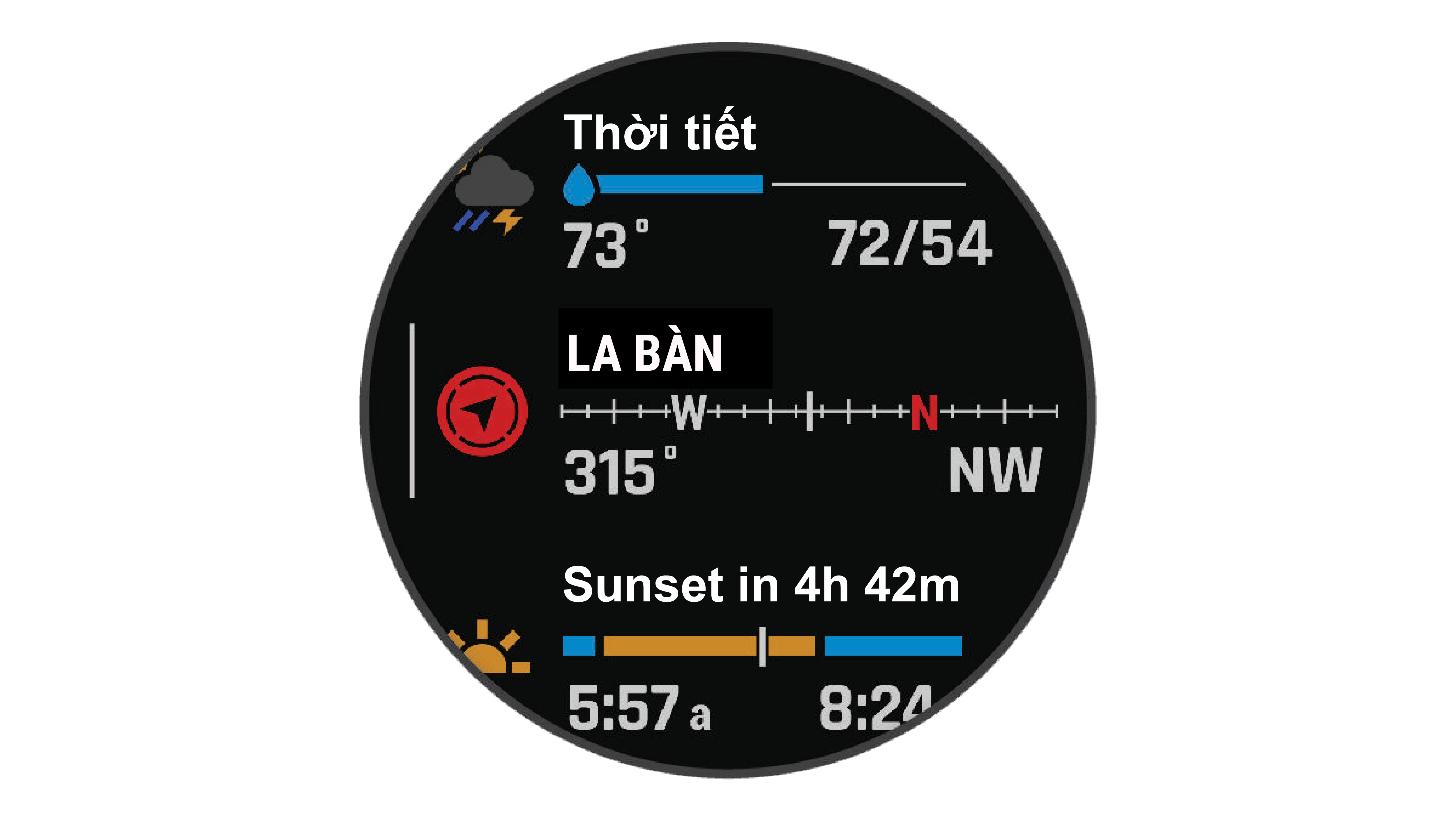Chế độ công cụ tổng quan giúp truy cập nhanh vào dữ liệu sức khỏe, thông tin hoạt động, cảm biến tích hợp trên thiết bị và hơn thế nữa. Khi bạn ghép nối đồng hồ của bạn, bạn có thể xem dữ liệu từ điện thoại của bạn, chẳng hạn như thông báo, thời tiết và sự kiện lịch.