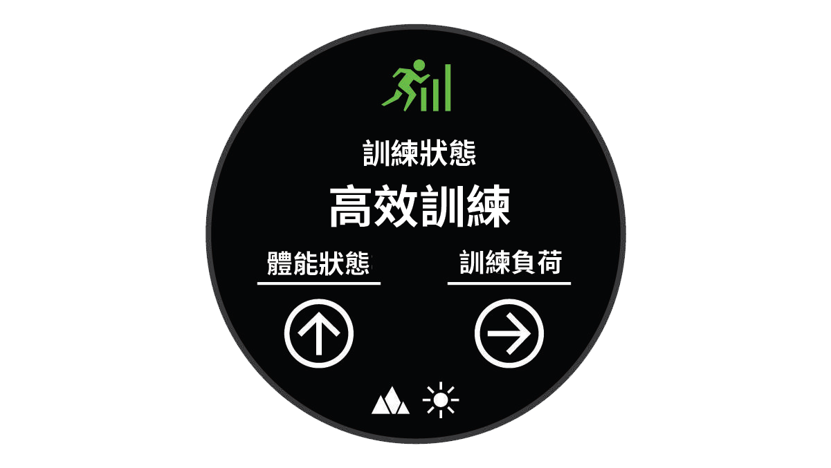 訓練狀態:訓練狀態顯示您的訓練如何影響您的體能與表現。訓練狀態是根據您的訓練負荷與最大攝氧量長時間的改變而取得。