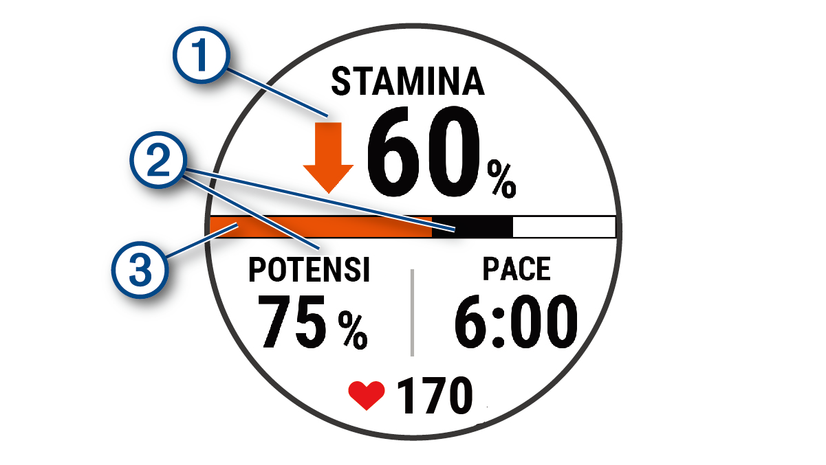 Jam tangan Anda dapat menyediakan perkiraan stamina secara real-time berdasarkan perkiraan data denyut jantung dan VO2 max. (Tentang Perkiraan VO2 Max., halaman 37).