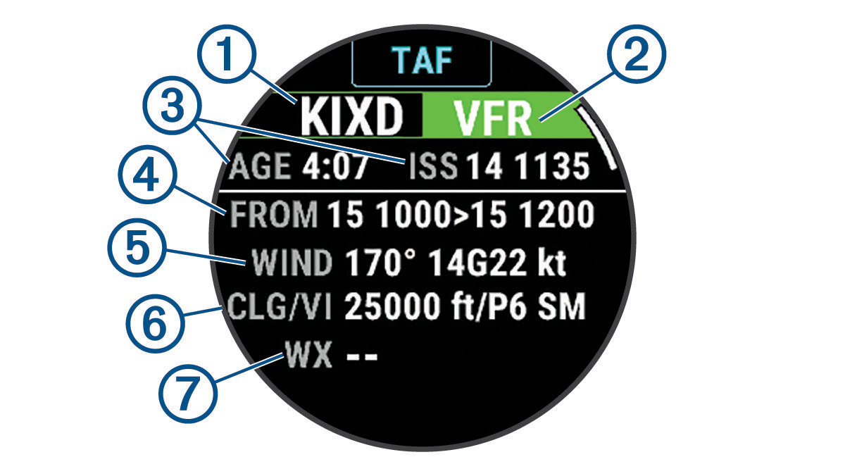 - ウォッチフェイスページでUPキーまたはDOWNキーを押して、航空天気ウィジェットを表示します。