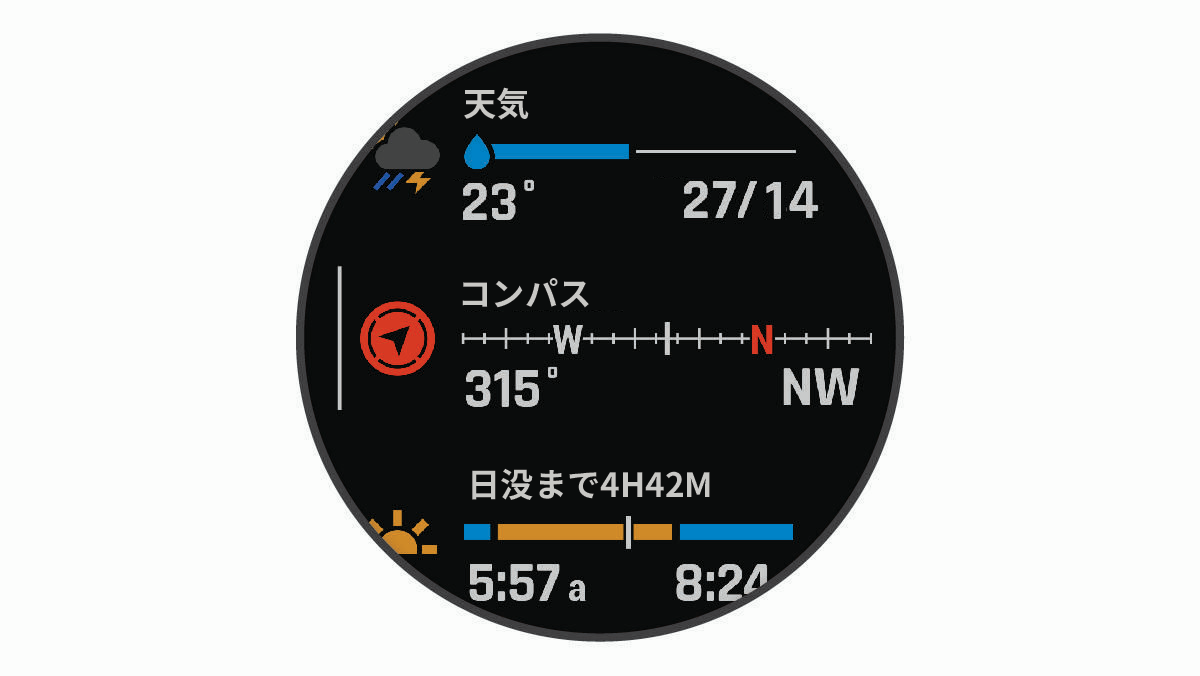 ウィジェット一覧を確認する ウォッチフェイスページからUPキーまたはDOWNキーを押します。ウィジェット一覧がスクロールします。ヒント:タッチスクリーンをスワイプして画面をスクロールできます。タップしてウィジェットを選択できます。 STARTキーを押すと、ウィジェットが全画面で表示されます。 次のオプションを選択します。さらに STARTキーを押すと、ウィジェットに関連するオプションが表示されます。UPキーまたは DOWNキーでウィジェットの詳細ページをスクロールできます。 ホーム表示ウィジェットウィジェット一覧を確認する