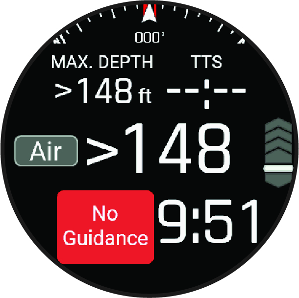 Your watch is dive certified up to a dive depth rating of 40 m (131.2 ft.). When you exceed a dive depth limit of 45 m (147.6 ft.), the watch stops reporting the depth, and No Guidance appears on the screen. When you ascend above 45 m (147.6 ft.), the watch continues reporting the depth. Information that requires accurate tissue loading is unavailable for the remainder of the dive, including no decompression limit (NDL) time, stop times, and time to surface (TTS).
