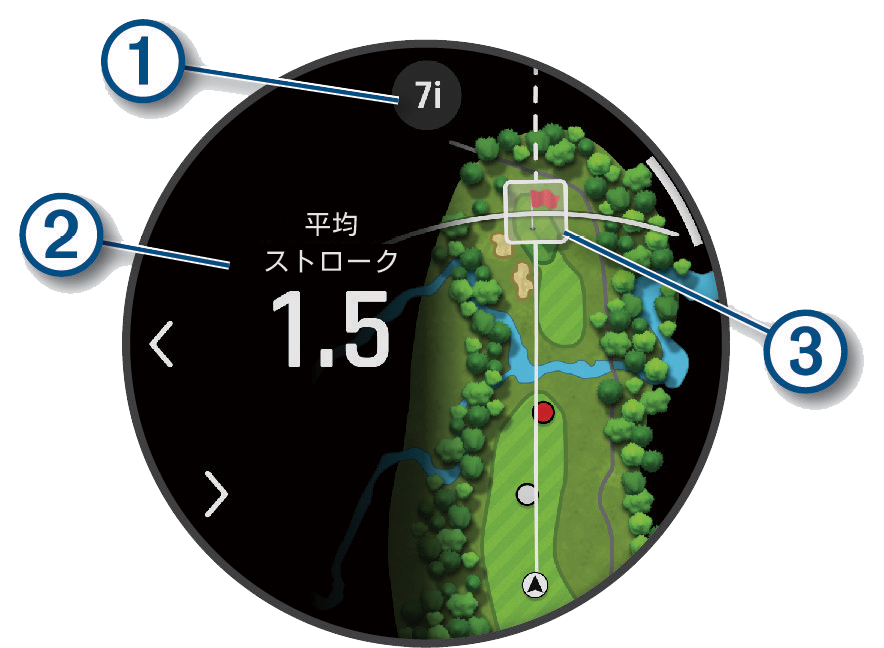 AMOLEDディスプレイ搭載モデルの場合:おすすめのクラブを使用した場合の次のショットの着弾地点予想範囲(クラブのショット履歴に基づいて計算されます) 注意:着弾地点の予想範囲にグリーンが含まれる場合、予想グリーンオン成功率が表示されます。 MIPディスプレイ搭載モデルの場合:おすすめのクラブを使用した場合の次のショットで狙う方向(クラブのショット履歴に基づいて計算されます) |