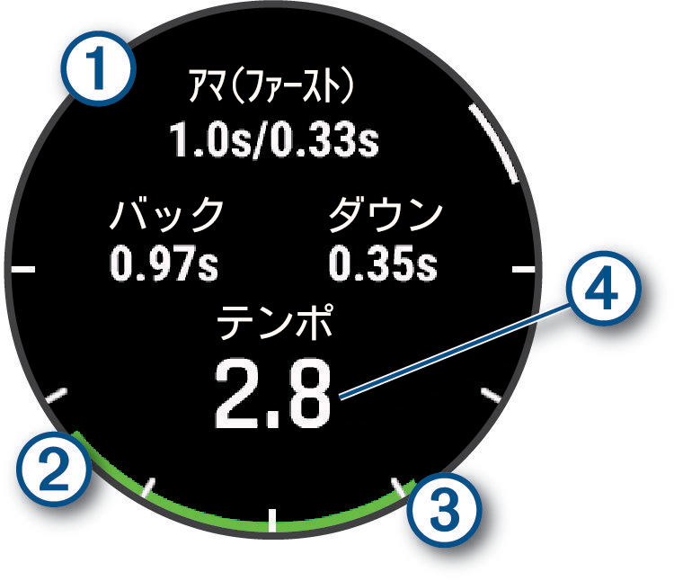 バックスイングまたはダウンスイングの速度が速すぎるのか、遅すぎるのか、タイミングが合っているのかをゲージで確認できます。