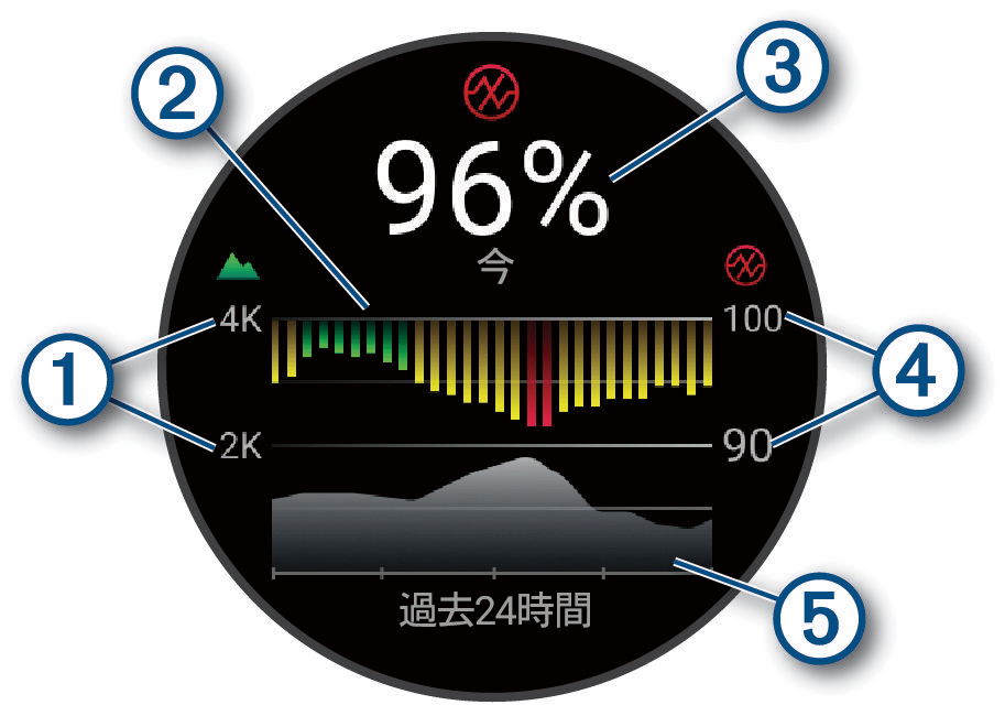 デバイスでは、血中酸素レベルはパーセンテージ(%)で表示されます。デバイスのデータをGarmin Connectアカウントに同期すると、Garmin ConnectやGarmin Connectアプリで、より詳細なデータを確認することができます。