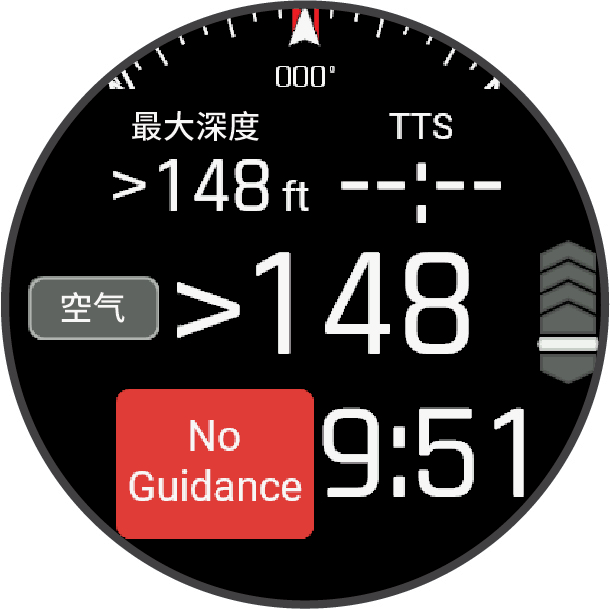 在剩余潜水时间内,无法取得需要正确组织负荷的资讯,包括免减压极限(NDL)、停留时间与返回水面时间(TTS)。NDL 字段将替换为警告消息。 |