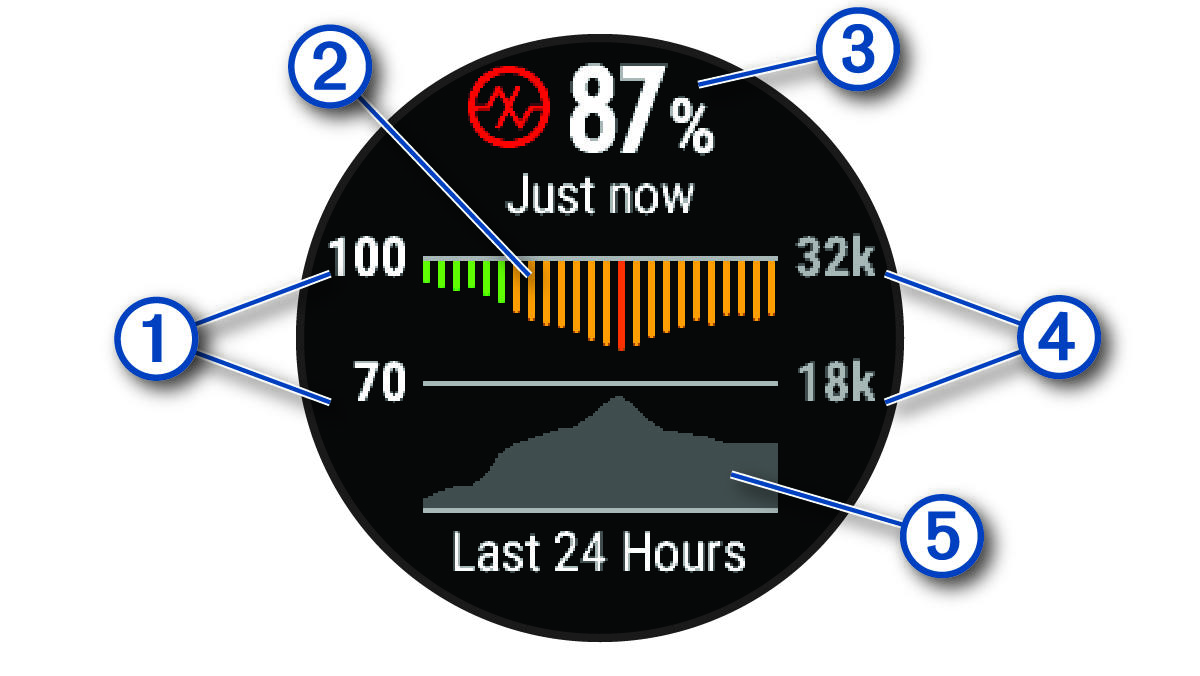 在手表中,您的血氧度数在图表上显示为血氧饱和度百分比。在Garmin Connect账户中,您可以查看有关脉搏血氧饱和度的其他信息,包括过去特定期间的趋势。