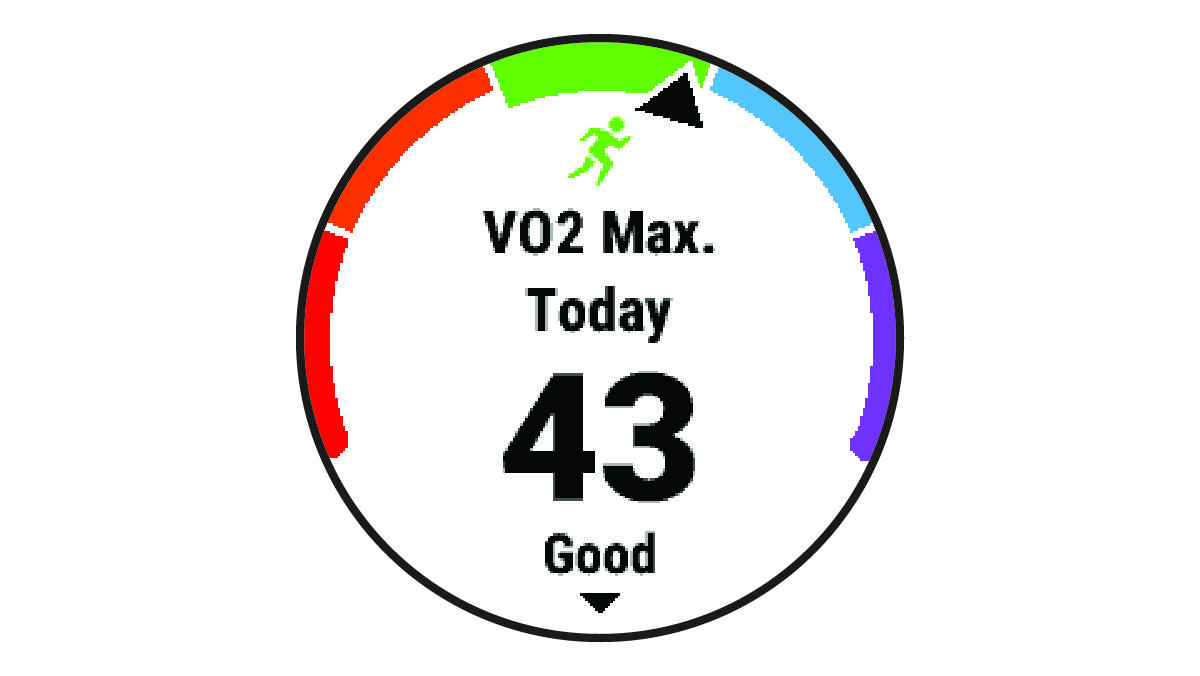 在设备中,您的最大摄氧量估算值会以数字显示,并定位于彩色量表上。您可以在Garmin Connect账户上查看更多有关最大摄氧量估算的资讯,包括您的身体年龄。随着持续运动,您的身体年龄应该随时间下降。