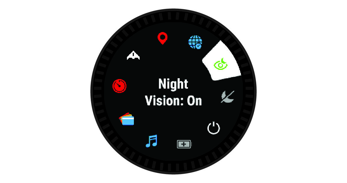 控制菜单内有快捷菜单选项,例如打开勿扰模式、锁定按键以及设备关机等。您可以开启隐蔽模式及夜视模式。您还可以开启Garmin Pay钱包。
